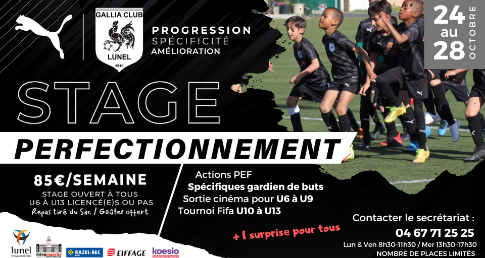 Comme chaque saison, le Gallia Club Lunel organise un stage de football d’une semaine durant les vacances. Le premier approche !!!